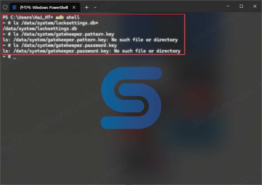 이후 해당 디바이스와 연결된 PC 에서 adb 를 이용하여 디바이스 콘솔에 접근한 다음 디바이스 잠금 파일에 해당하는 아래 세 개 파일을 확인한다.