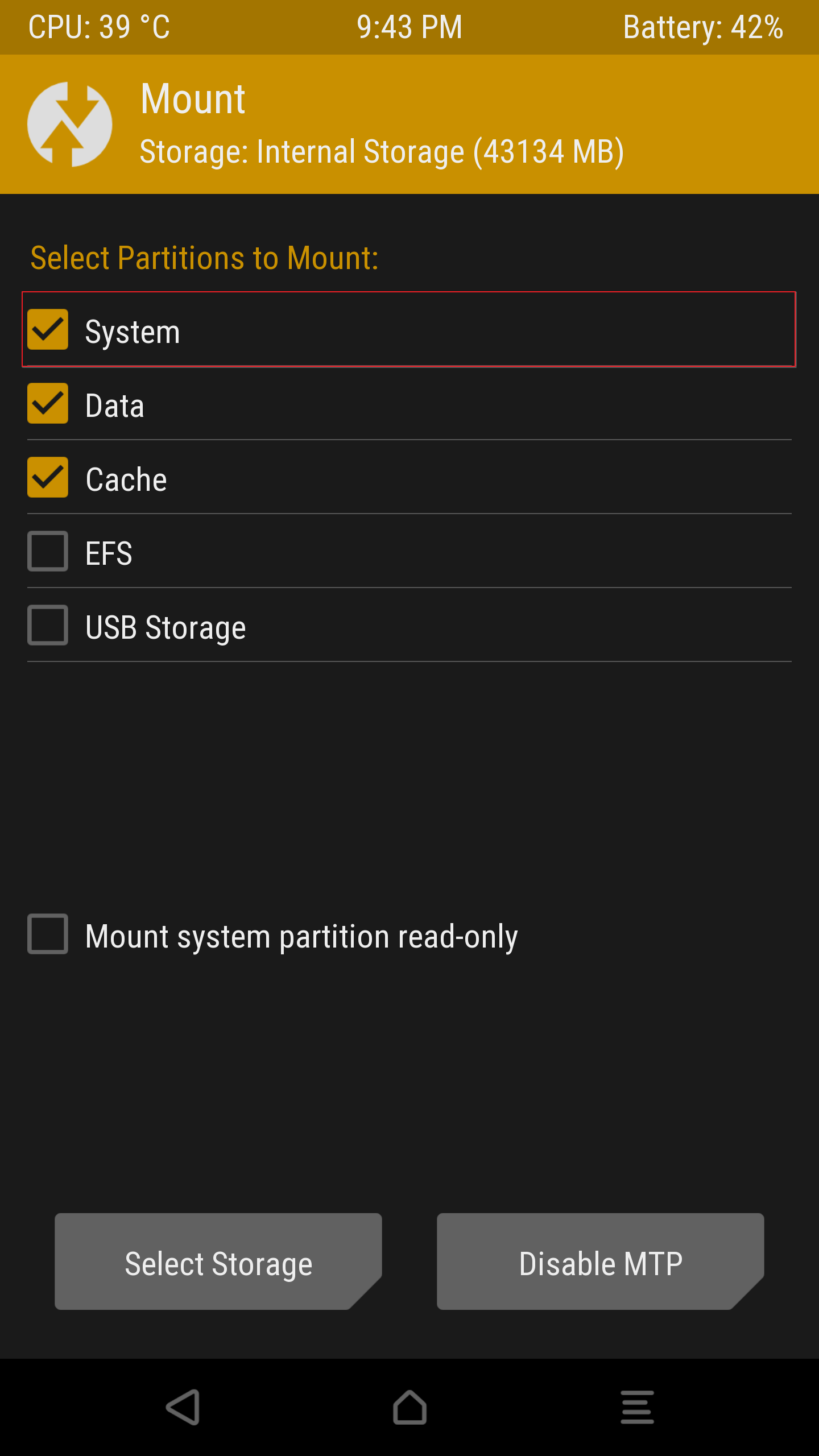 TWRP 접근 이후 Mount 메뉴에 접근하여 'System' 파티션을 체크한다.