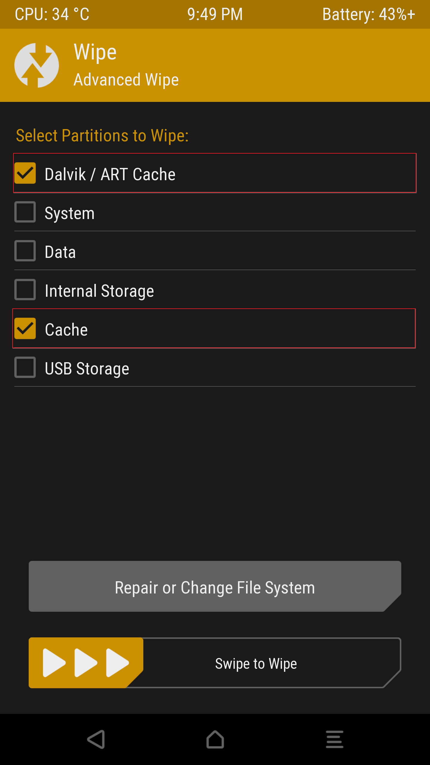 다시 디바이스로 돌아와서 Wipe 메뉴에서 'Dalvik / ART Cache' 와 'Cache' 를 선택해 Wipe - 삭제를 진행해준다. 삭제 진행 후 디바이스를 재부팅 해주면 된다.
