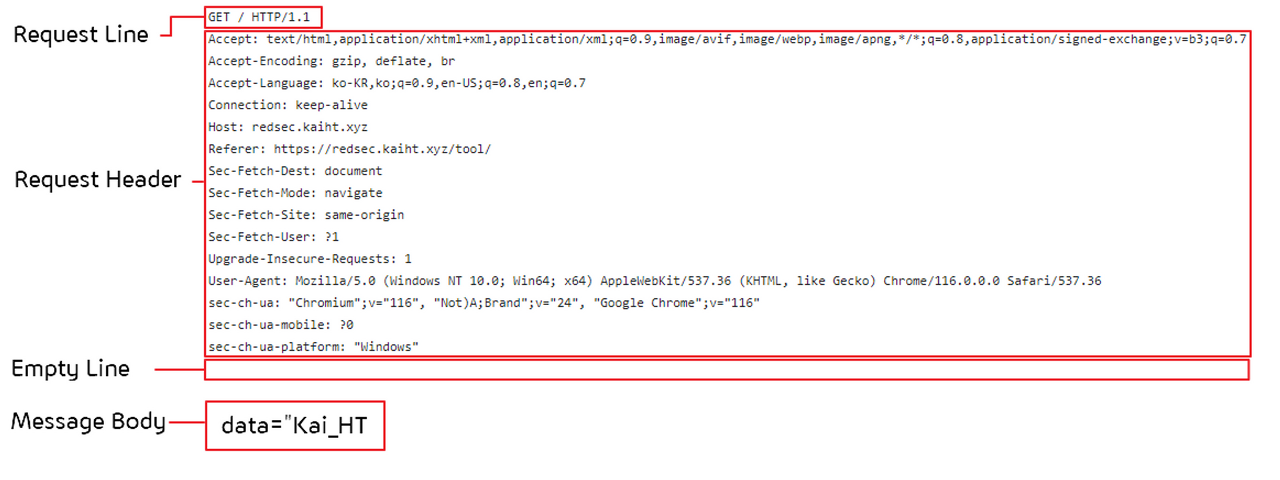 구성은 크게 4 가지로 볼 수 있는데 요청 라인, 요청 헤더, 빈 줄, 메시지 바디 이다.