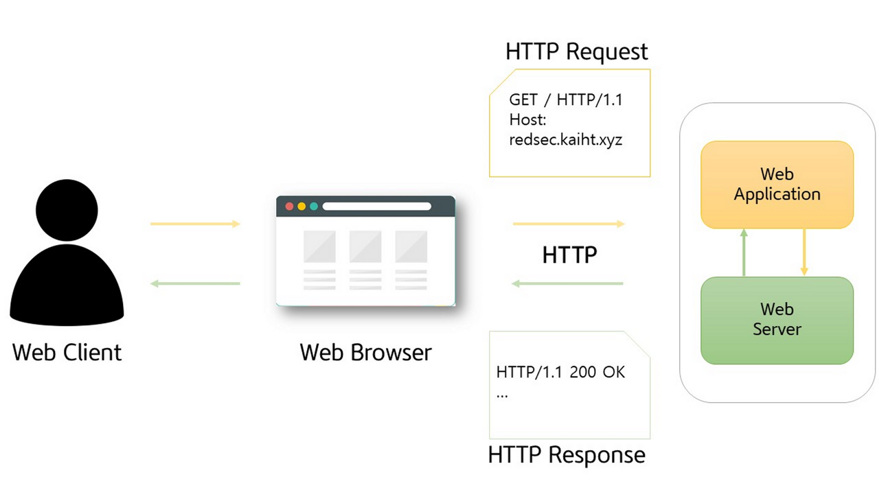 웹 사용자가 브라우저 주소 표시줄 내 URL (http://redsec.kaiht.xyz) 를 입력하여 이동 요청을 전달하게 되면 입력받은 브라우저 (클라이언트 단) 는 DNS 서버로 부터 입력된 웹 주소의 IP 정보를 알아오며, HTTP 프로토콜을 통해 웹 서버 사이트 사본을 요청한다. 요청 URL에 해당하는 웹 서버는 구동 웹 애플리케이션에서 해당하는 웹 페이지 - 문서를 브라우저에게 응답 값으로 전달하며 응답 값을 전달 받은 웹 브라우저는 페이지를 화면 단에 표시해준다.