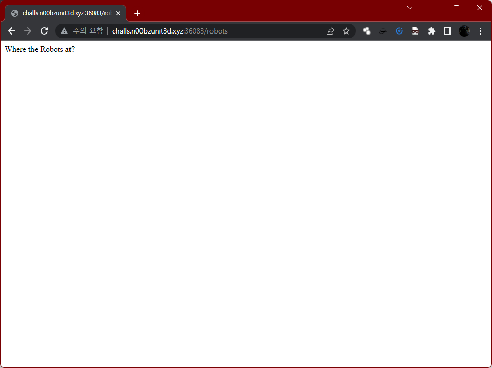문제 페이지 접근 시 'Where the Robots at?' 이라 묻고 있다. 고민할 필요도 없이 본인은 웹 크롤러들의 페이지 접근 제어 규약 파일은 'robots.txt' 파일 존재여부를 묻는다 판단하였다. 해당 파일의 경우 웹 사이트의 최상위 경로 - 루트에 위치해야 하므로 페이지 URL 내 /robots.txt 를 URL 내 삽입하여 접근시도하고자 판단이 들었다.