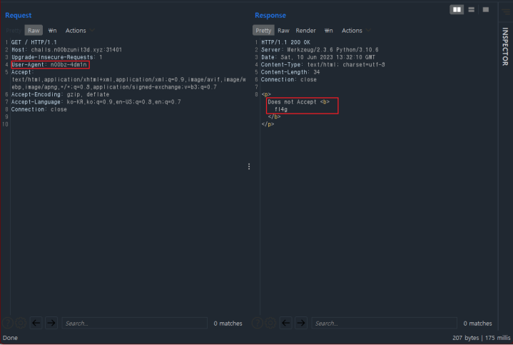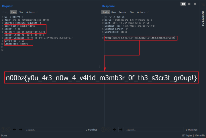 User-Agent 값을 첫번 째 페이지에서 확인 가능한 'n00bz-4dm1n' 값으로 변조하여 전달한 결과, 서버에선 앞서 나온 결과와 다른 문자열을 내놓았다. 수신된 값에선 Accept 값이 잘못되었다 말하고 있으며 마지막 단어로 fl4g 값을 전달하였다. 해당 Accept 값도 User-Agent 값과 동일하게 응답 값을 참고하여 fl4g 로 작성 후 전달을 요청한다.
